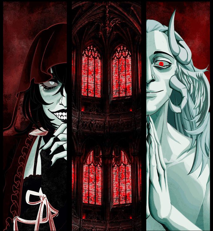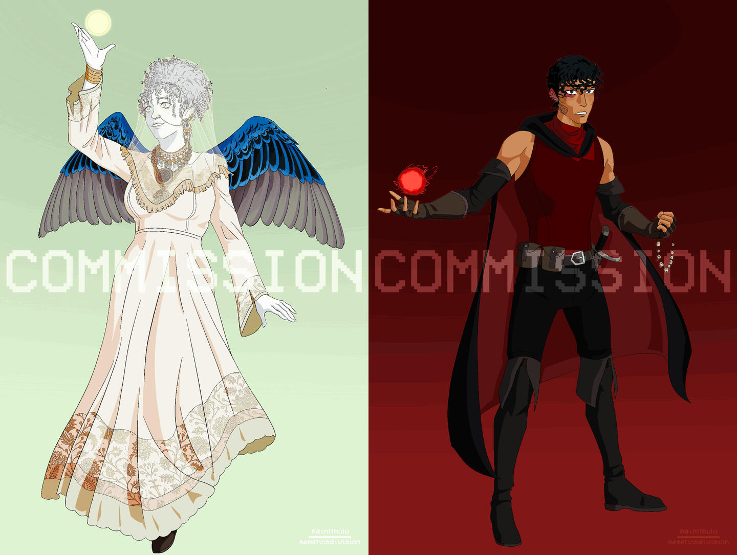 "i would like to commission a fully rendered piece with 2 fullbodies and a scene background"provide any extra details such as the characters you want drawn, an overall vibe for the piece (atmospheric, portrait, character scene etc.), and any other specifics you'd like to see (example: a character drawn a certain way or a specific part of their design included/highlighted).